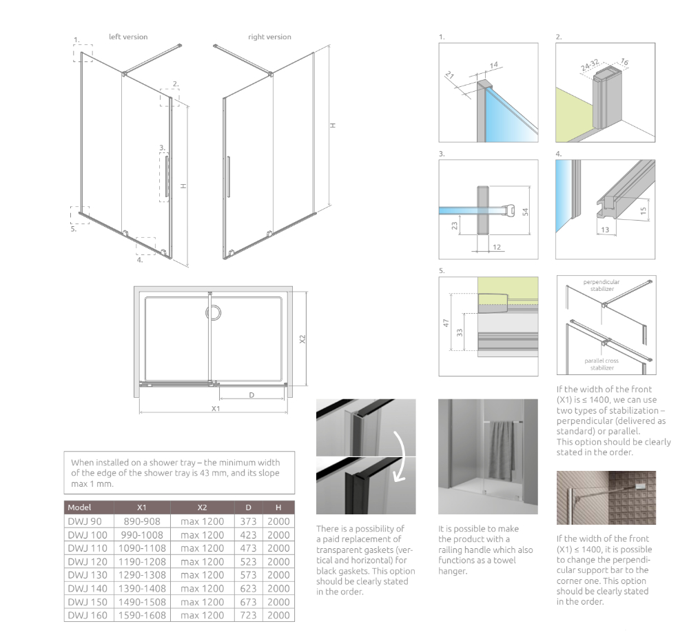 Liuguksega FURO DWJ 160cm avasse harjatud vask viimistlusega dušiklaaside sari. Sujuva reguleerimissüsteemiga, rullid mis paiknevad klaasi alumises osas, mitte ülemises nagu tavapäraselt. Rullide paiknemine klaasi alumises osas annab dušinurgale puhta ülemise klaasi joone. Liikuvad klaasiosad on väljapool dušinurka. Kriimustuskindel lävepakk ja ergonoomilised käepidemed. Klaasid on paigaldatavad nii plaaditud põrandale kui dušialusele.