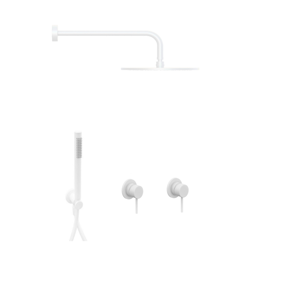 Matt valge viimistlusega segisti komplekt LIGHT koosneb: 1-väljundiga segisti Light 2tk. + seinatoru 40cm + vihmadušš 22,5cm + käsiduši komplekt. Segisti sisaldab seinasisest elementi.