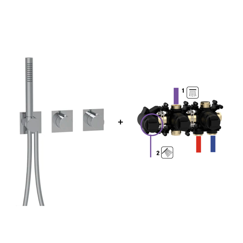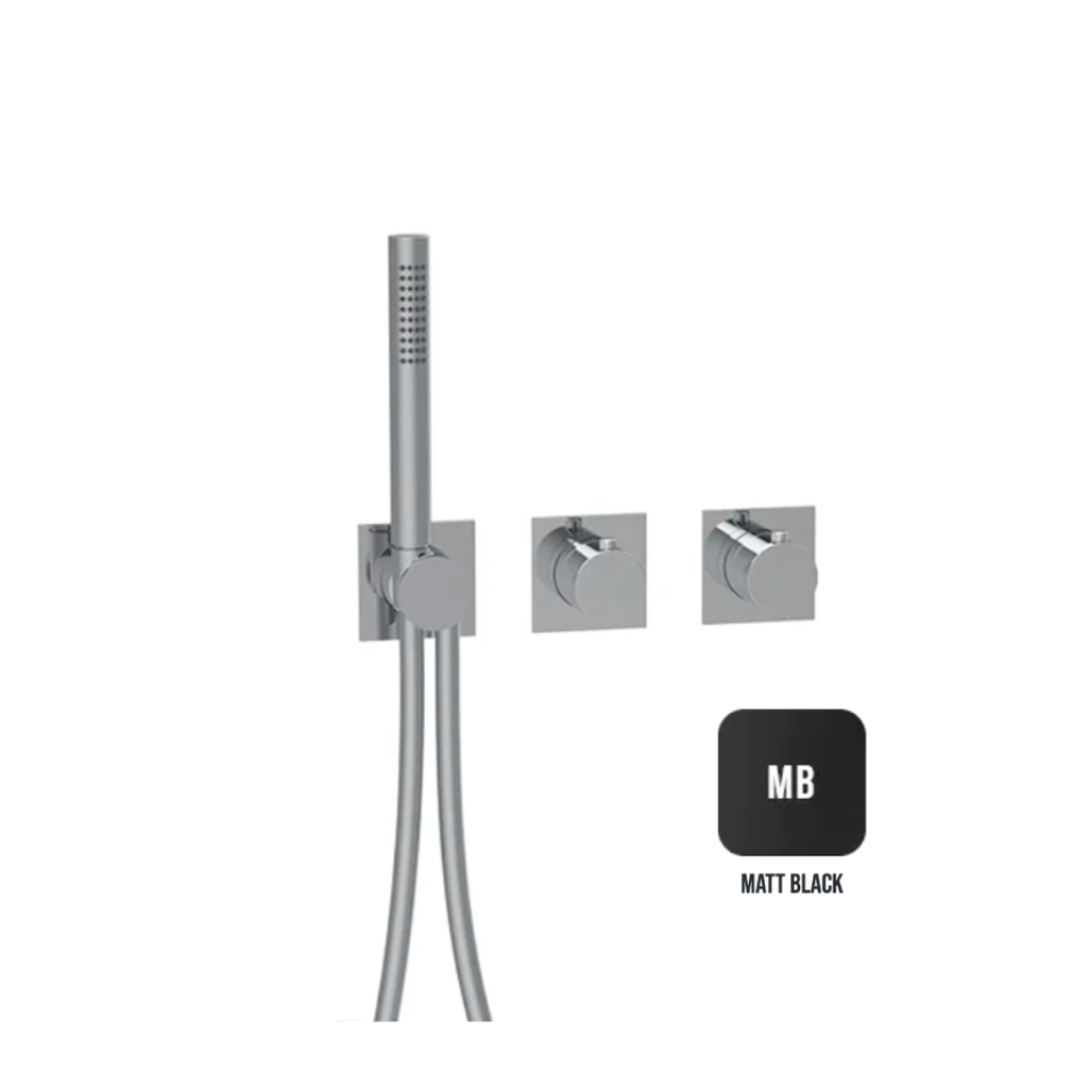 Seinasisene termostaatsegisti MODULAR Square, matt musta viimistlusega. Komplekt sisaldab – seinasisene moodul (termostaat, 2-suunaline diverter käsidušile ja vihmadušile). + seinapealne väline osa kandiliste rosettidega (matt must) koos käsidušiga. Vastavalt soovile lisandub vihmaduši osa, laest või seinast. Küsi pakkumist erinevatele viimistlustele. Seinasisene moodul laos.