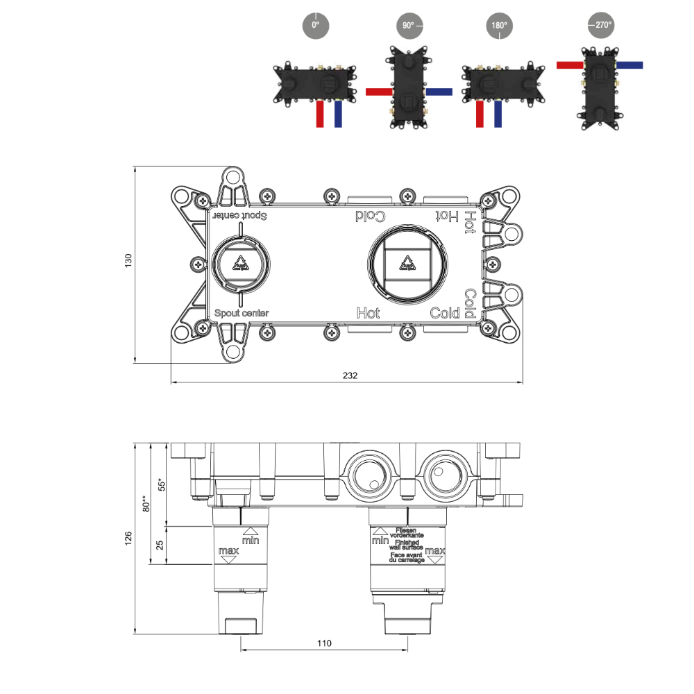 Seinasisene valamusegisti komplekt sisaldab – seinasisene boks + seinapealne segisti osa 155mm tilaga, kroom viimistlusega. Suur valik erinevaid viimistlusi ja tila pikkused 125mm ja 185mm. Paigaldus – horisontaalselt (vasak või parem pool), vertikaalselt (tila all/üleval).