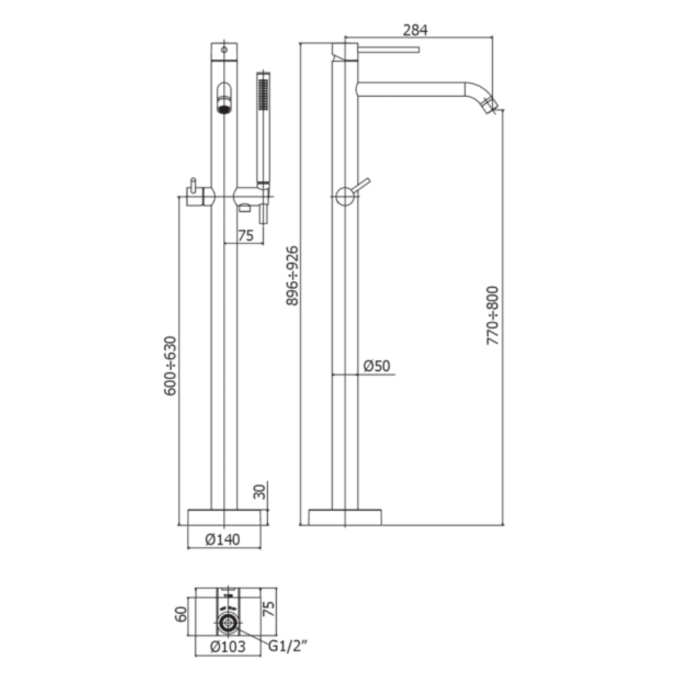 Matt valge viimistlusega põrandapealne vannisegisti Light koos põrandasisese elemendiga. Komplekt sisaldab MASTER metallist käsidušši ja PVC voolikut 150cm.