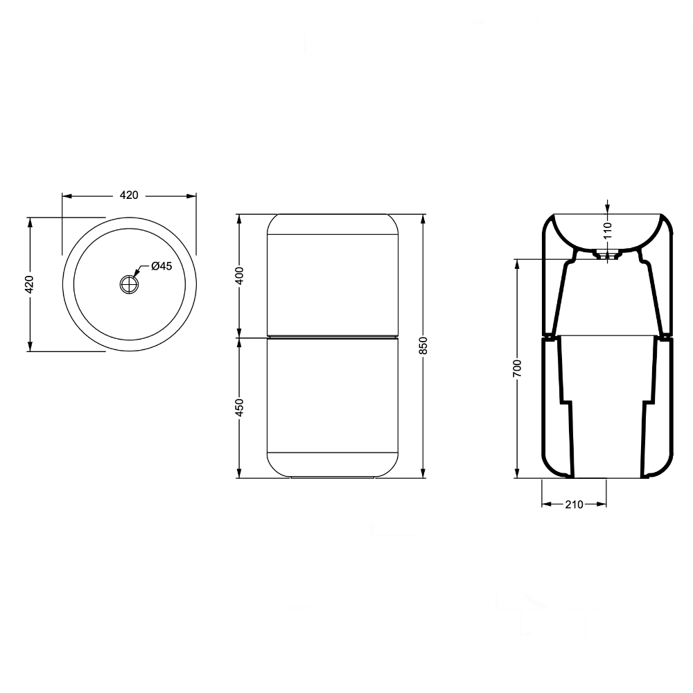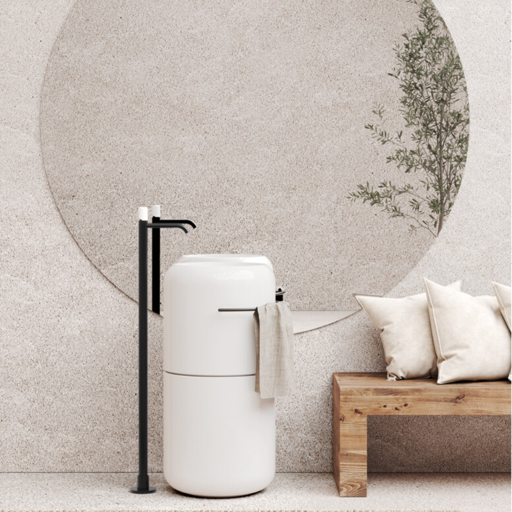 Keraamiline põrandapealne valamu PETRA ø42 h85cm, läikiv valge viimistlusega. Valamu on komplekteeritud integreeritud click-clack keraamilise kattega põhjaklapiga, anti-backflow sifoonisüsteemiga ja universaalse kroomitud roostevabast terasest äravoolutoruga põrandasse (tellimisel äravool seina). Võimalus komplekteerida messingist käterätipuuga (erinevad viimistlused – matt valge ja must, kroom, pronks, kuld ja RAL toonid).