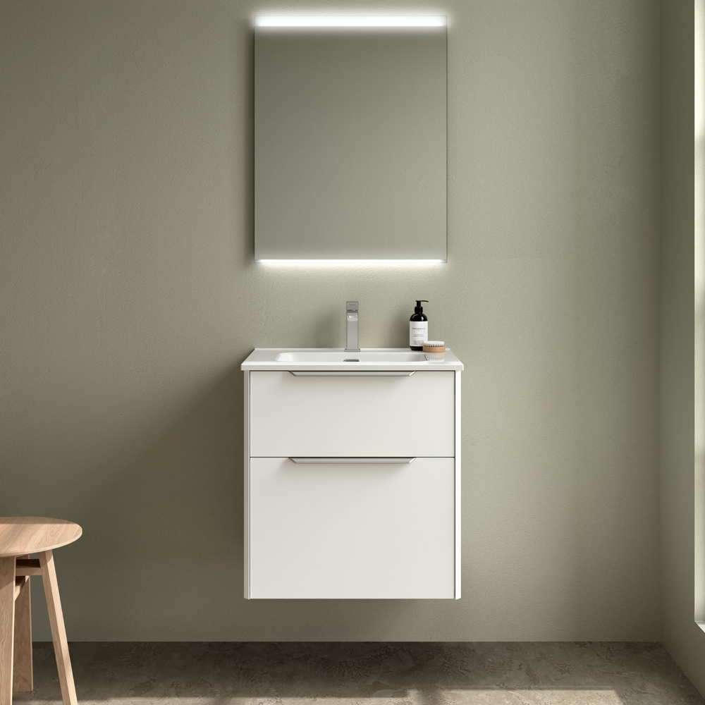 Valamukapi LUVA 60cm komplekt – segistiavaga keraamiline valamu + 2 sahtliga valge satiin valamukapp 60x45cm + käepidemed läikiv metall viimistlusega.